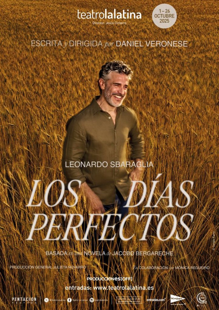 El Teatro La Latina acogerá desde el 1 al 26 de octubre Los días perfectos, un monólogo protagonizado por Leonardo Sbaraglia con el que debuta  en teatro en España, adaptado, dirigido y ambientado musicalmente por Daniel Veronese, basado en la novela homónima de Jacobo Bergareche.
