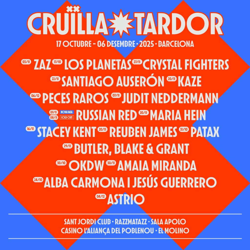Del 17 de octubre al 6 de diciembre, el Cruïlla Tardor llevará a cinco salas emblemáticas de Barcelona —Sant Jordi Club, El Molino, Sala Apolo, Razzmatazz y el Casino de l’Aliança del Poblenou— más de 15 conciertos, con propuestas nacionales e internacionales para todos los gustos. En esta edición destacan el esperado regreso de ZAZ, el primer concierto en España de Butler, Blake & Grant, y una propuesta única de fusión lingüística entre euskera y catalán de la mano de Judit Neddermann.