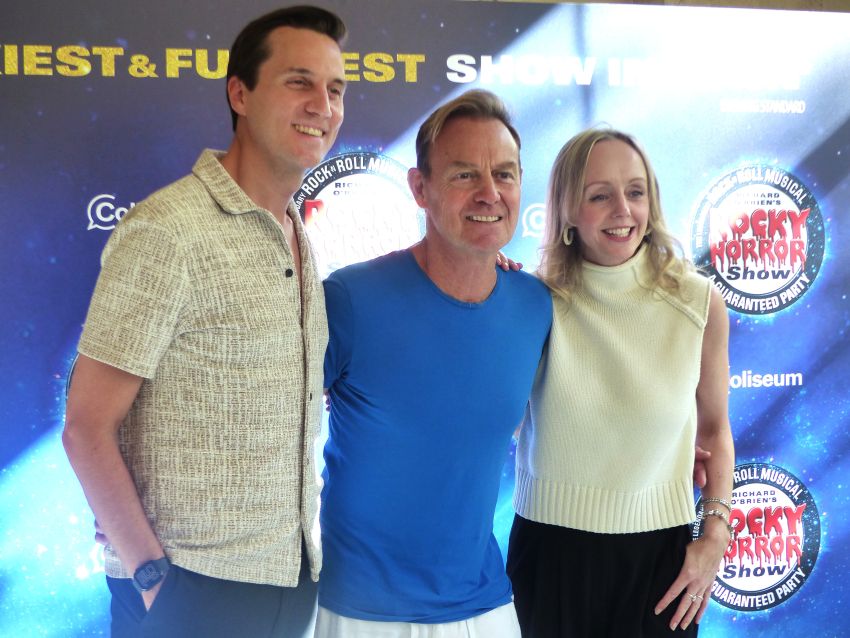 En la imágen Jason Donovan, protagonista (Frank-n-Furter); Haley Flaherty (Janet) y James Bisp (Brad) en la presentación del musical celebrada esta mañana. Fotografía de Albert Roca.