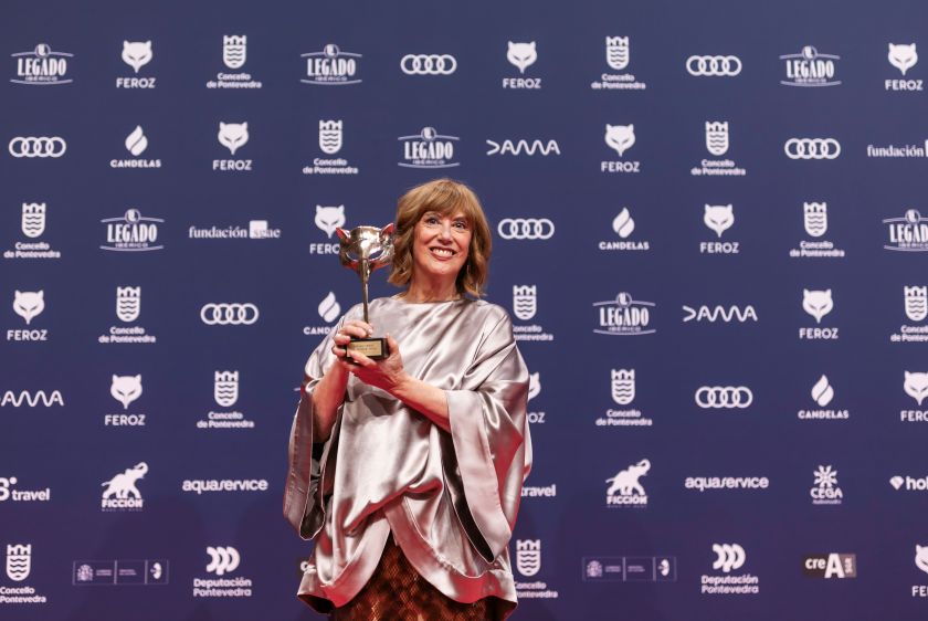 Ilusionada y muy feliz, la veterana actriz Marta Fernández-Muro subió al escenario para recoger “un premio que me encanta”, su Feroz de Honor. Con el humor que la caracteriza, recibió la estatuilla de manos del actor Raúl Cimas ante el aplauso de todos los asistentes. Un reconocimiento a toda su carrera, de la desveló muchas curiosidades el pasado jueves en su charla magistral en el Teatro Principal de Pontevedra.